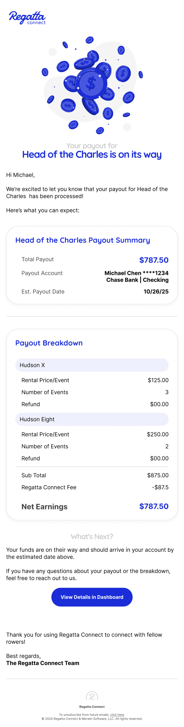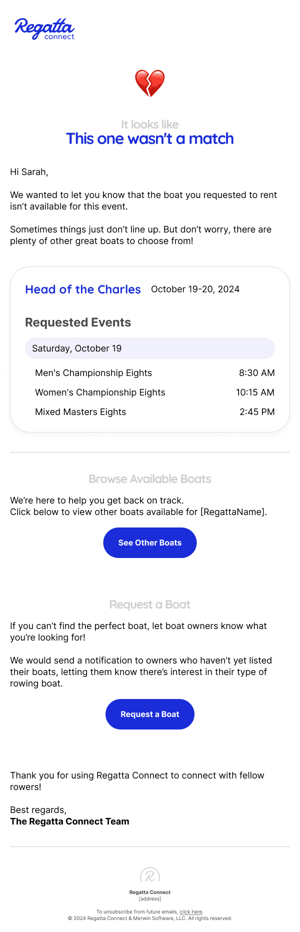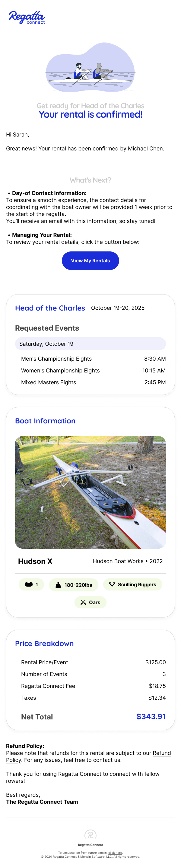 Brand identity and email templates for an online marketplace where rowing clubs and boat manufacturers rent unused boats during races — so visiting clubs can skip the logistics of bringing their own, and racers can test new equipment on the water.